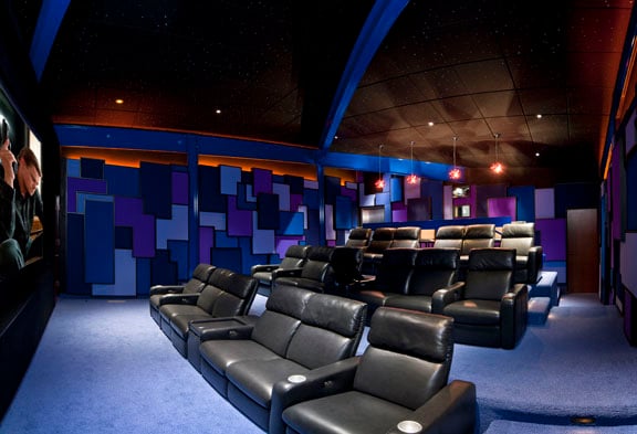 After all, the owner wanted the biggest and best theater. AVI worked closely with the architect for speaker placement in the cubist wall design, and some of the rectangles conceal acoustical treatments to help tame the sound. To top if off, an iSky fiber-optic starfield shines down on the room's occupants. With everything else going on in this room, we wonder if they notice.